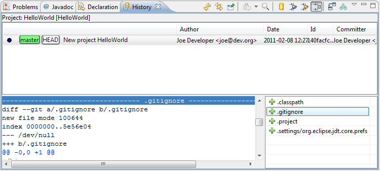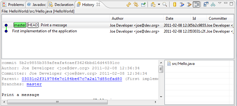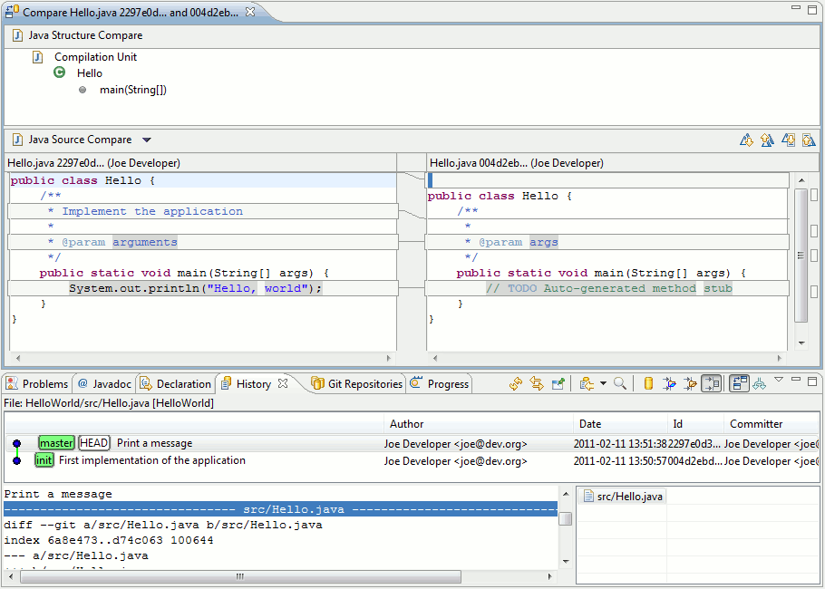 src/Hello.java in the Resource list of the History View to open your last committed change in the Compare View.