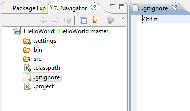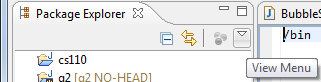 .gitignore displayed in the Package Explorer. To access filters, select the down arrow on the right edge of the Package Explorer tab to display View Menu.