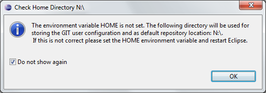 EGit shows a warning if HOME is not defined explicitly. Keep in mind that if you set the HOME environment variable while Eclipse is running, you will still see following warning. You will have to restart Eclipse for it to recognize the HOME value.